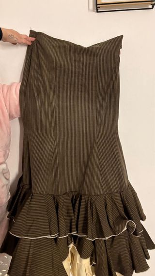 Preciosa traje campero para baile flamenco, ideal para lucir en cualquier evento. Es una prenda única y vistosa. - Tiene varios volantes superpuestos. - La tela es de rayas granates y negras. - Está en perfecto estado. Hecho a mano