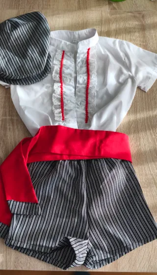 Conjunto de traje de gitano o campero para niño, talla 1 y da talla porque es elástico (9-12meses 74-80cm) Incluye camisa blanca, pantalón a rayas, fajín rojo y gorra. - Camisa blanca con detalles rojos y dorados. - Pantalón corto a rayas grises y negras. - Fajín rojo ancho. - Gorra a juego con rayas.