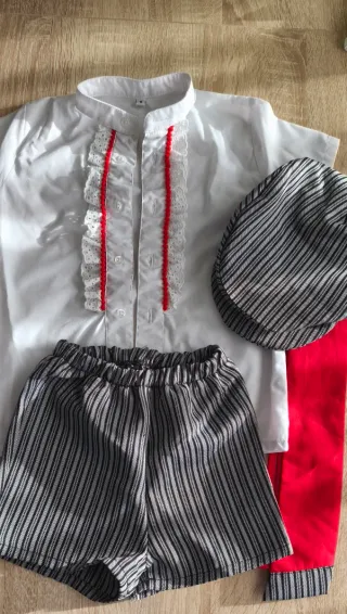 Conjunto de traje campero para niño, talla 5 años, con detalles de artesanía andaluza. - Camisa blanca con adornos rojos y encaje. - Pantalón corto a rayas grises y negras. - Fajín rojo de tela satinada. - Gorra a juego con rayas. - - -Cómo Nuevo.