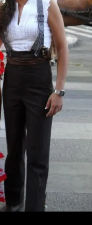 Pantalón campero con un diseño de rayas verticales. - Rayas finas en gris y blanco. - Dobladillo en los bajos. - botones para los tirantes Medida: Cintura 51cm cadera 54cm largo 107cm talla 48