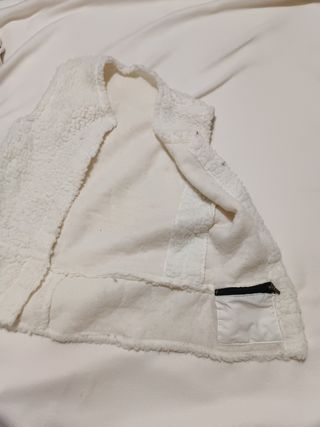Chaleco de borreguillo con bolsillo interior. Casaca negra satén. Talla 6 años. La casaca está nueva. El chaleco tiene algo más de uso. Lleva dos corchetes para cierre delante y un bolsillito interior con cremallera.