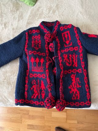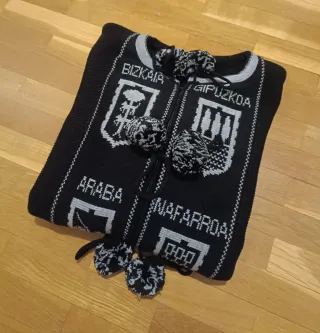Chaqueta de estilo vasco, tipo kaiku, traje de casero Olentzero. Presenta un cierre de cremallera frontal y detalles de pompones. - Tejido de punto negro y gris. - Diseños de escudos y nombres de provincias vascas: Bizkaia, Gipuzkoa, Araba, Nafarroa. - Adornada con pompones decorativos. Costó 115€ y se encuentra en perfecto estado sin ninguna clase de uso. Se encuentra en mi armario también a la venta un chaleco de casero y lauburu tallado en madera de boj. Se puede entregar en Pamplona y Donosti sin coste adicional.