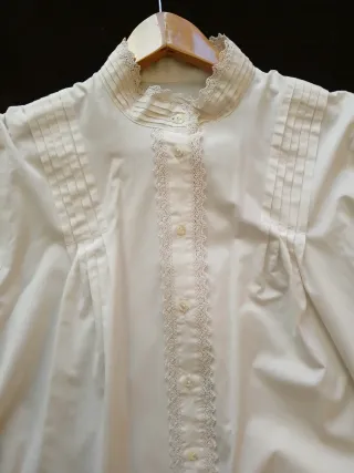 Camisa de traje de casera en color blanco roto. Presenta un diseño con cuello alto y detalles de puntilla. - Cuello alto con puntilla. - Cierre de botones. - Mangas largas abullonadas. - Puños con botones y puntilla. - Adornos de puntilla en la parte delantera.