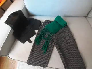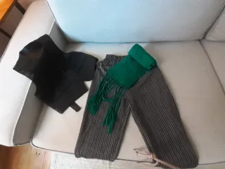 Conjunto de traje casero vasco. Ideal para 5-6años. Talla 6 tirando a pequeña. - Chaleco negro. - Pantalón mil rayas grises y negras. T6 - Gerriko infantil verde Puedo añadir la camisa tipo lino de ZARA en color crudo con cuello mao que es muy similar a la camisa tradicional. +10€