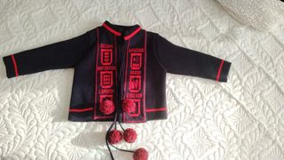 Chaqueta de estilo tradicional vasco, conocida como baserritarra. Presenta un diseño tejido con detalles en rojo sobre fondo negro. - Cuello redondo con ribete rojo. - Cierre frontal. - Mangas largas con puños y borde inferior en rojo. - Adornada con pompones rojos y cordones. - Como para niño de hasta 3 años casero, baserritarra, olentzero, pastor, vasco