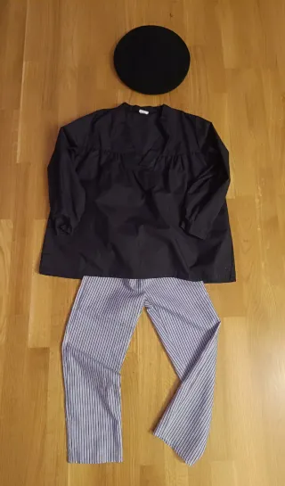 Conjunto de traje tradicional vasco, conocido como baserritarra o casero. T. 8 menudito. Incluye camisa, pantalón y txapela lana negra - Camisa negra de manga larga. - Pantalón a rayas azules y blancas. - Txapela negra lana