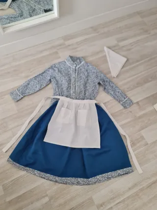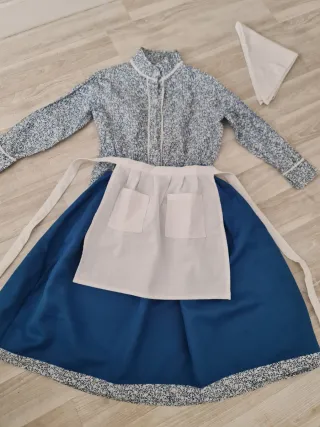 Conjunto de traje de casera en talla 6 en tonos azules, súper bonito. Compuesto por falda, blusa, delantal y pañuelo. Esta en buen estado salvo algún hilo salido que tiene la falda. Baserritarra, neska, aldeana, arrantzale, euskal jaiak, euskal jantziak, euskal dantzak, meltxora, vasquita, baturra, traje regional, traje tradicional, traje tipico vasco, pasiega, paisana, pastora, pastorcita, pastorcilla