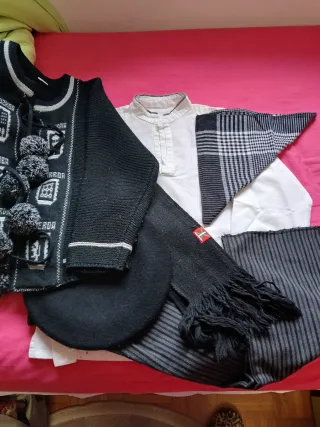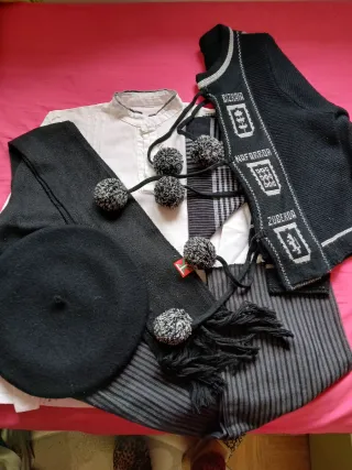 Conjunto Traje casero vasco. - Txapela negra. - Jersey de punto color crema. - Pantalones a rayas talla 8 con cintura de goma. 80 CMS de cintura a tobillo - Pantalones azules. - Chaleco marrón de pelo. - Casaca negra Talla 4 amplia - Gerriko. - Pañuelo de cuadros y otro rojo. - Medias.