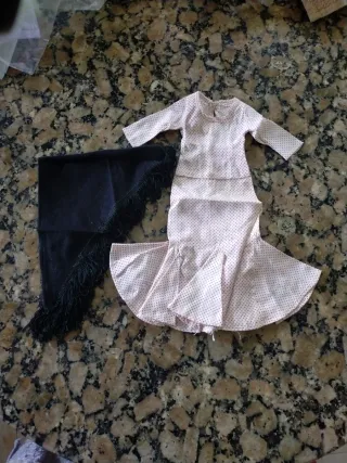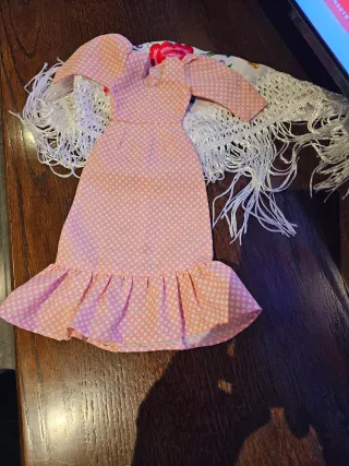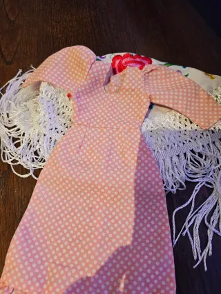 Traje de chulapa válido para muñeca Nancy. Incluye vestido y mantón. - Vestido rosa con topos negros. - Mantón negro con flecos.