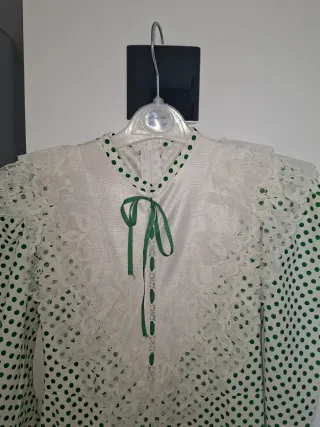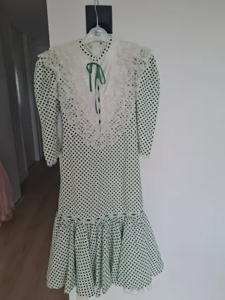 Traje de chulapa para niña, ideal para fiestas y eventos. - Diseño de lunares verdes sobre fondo blanco. - Cuello y mangas con encaje. - Detalle de lazo y botones en la parte delantera. - Falda con volantes y puntilla.