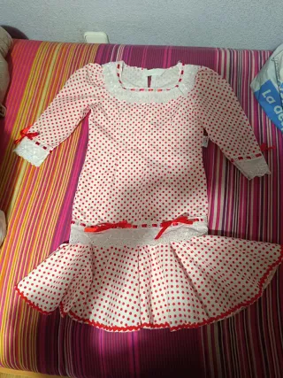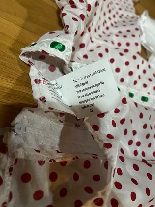 Disfraz de chulapa clásica para niña, ideal para fiestas y eventos, sin uso, a estrenar. - Talla 7-9 años. - Incluye vestido y pañuelo. - Diseño de lunares rojos sobre fondo blanco.