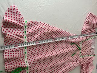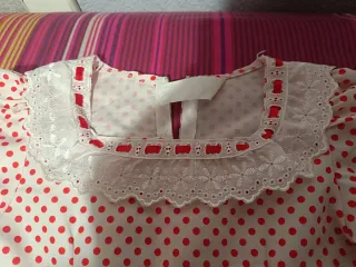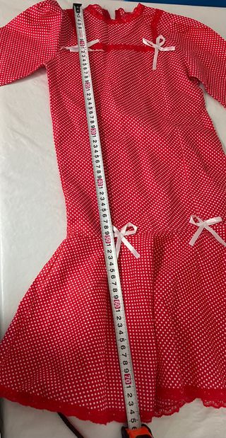 Largo del traje 72cm. Traje de chulapa con estampado de lunares rojos sobre fondo blanco. Ideal para fiestas de San Isidro en el colegio. - Mangas abullonadas con volante (cosidas en casa para que luciera un poco más que el típico traje de bazar). - Volante en la falda con puntilla y lazo. - Cuello adornado con puntilla y lazo, entallado. - Por detrás tiene elástico para que quede entallado.