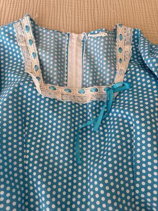 Traje de chulapa azul con estampado de lunares blancos. Talla 2-3 años. Medidas en las fotos. El bajo está deshilachado, por eso lo regalo.