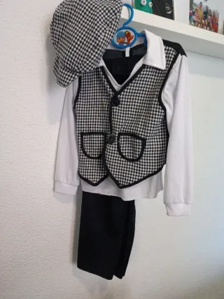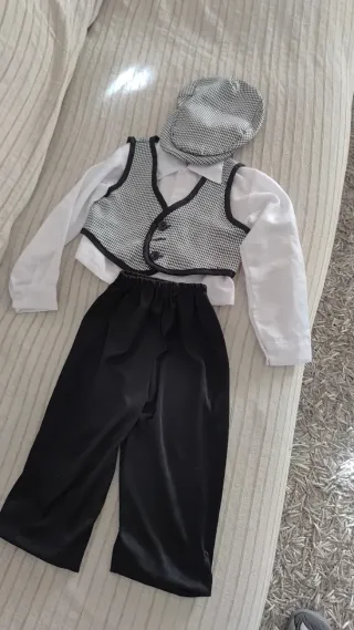 Conjunto de chulapo para niño, talla 3/4 años. - Camisa blanca. - Pantalón negro. - Gorra a cuadros. - Tambien disponible un pantalon talla 1/2 ya que da mucha talla