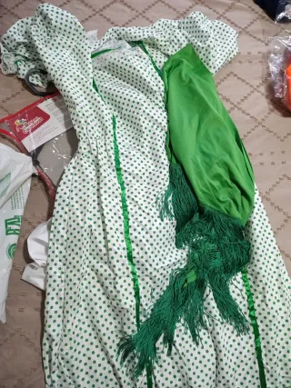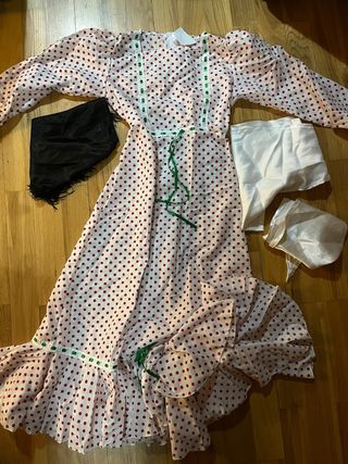 Traje tradicional de chulapa madrileña, ideal para fiestas y eventos. - Vestido blanco con lunares rojos. - Adornos verdes en el escote y bajo. - Mangas abullonadas. - Incluye mantilla negra y pañuelo blanco. Talla 7-10