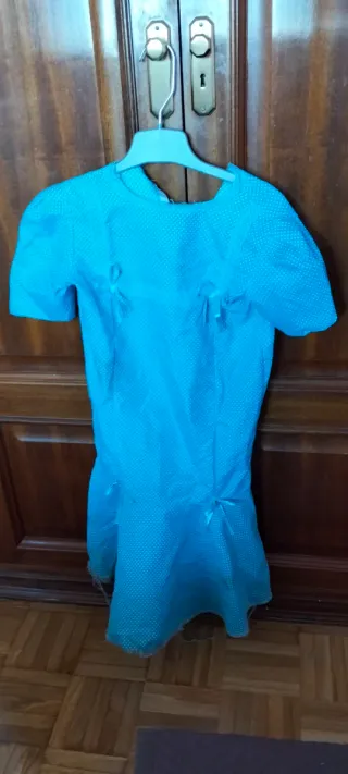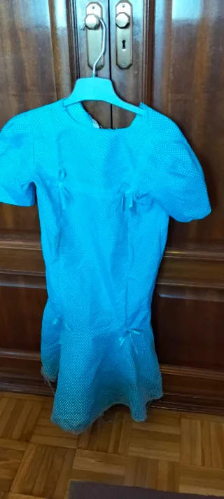 Traje de chulapa para niña, ideal para fiestas tradicionales. Talla 5/6 años - Vestido azul turquesa con lunares blancos. - Adornado con encaje y lazos. - Mangas algo abullonada - Con flor blanca incluida