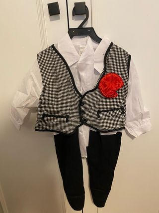 Conjunto de traje Chulapo infantil. Talla 0-6 meses. Incluye: - Chaleco - Pantalón - Camisa - Pañuelo - Gorra - Clavel con pinza para completar (regalo). Cómo nuevo, se ha usado unas horas.