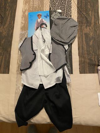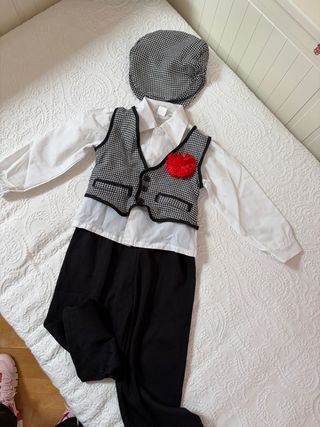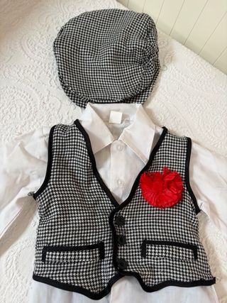 Conjunto completo de chulapo, talla 0-1 año. Incluye: - Chaleco de cuadros. - Pantalón negro. - Gorra a juego. - Pañuelo blanco. - Flor roja de pinza Cómo nuevo, solo unas horas de uso.
