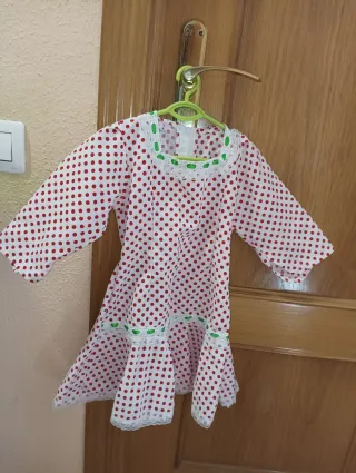 Traje de chulapa para bebé con un diseño alegre y tradicional. - Estampado de lunares rojos sobre fondo blanco. - Adornado con encaje blanco y detalles verdes. - Mangas largas y falda con vuelo. - Talla como de 6 a 24 meses aprox (puede servir para varias tallas). Medidas en las fotos. Sólo 1 uso de mi hija, está como nuevo.