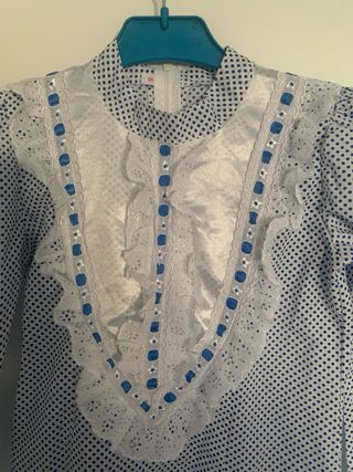 Traje tradicional de chulapa para niña, ideal para fiestas y eventos. Tiene una ligera mancha abajo - Diseño de lunares en blanco y azul. - Volantes y encajes en el bajo y el pecho. - Mangas abullonadas.