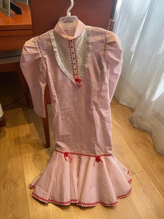 Traje de chulapa para niña de seis años. •Medidas: -Largo del vestido: 72cm -Largo de la falda: 50cm -Contorno de cintura: 20cm -Ancho de axila a axila: 28cm