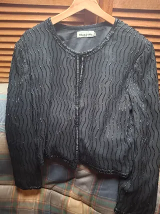 Elegante chaqueta de fiesta con un diseño de ondas negras. Solo una puesta para una boda - Adornada con pedrería. - Cuello redondo. - Cierre central.