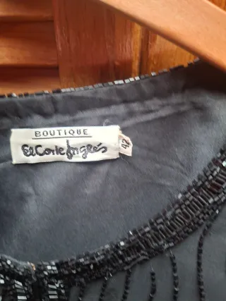 Elegante traje de chaqueta y pantalón de corte clásico color champagne/dorado de El Corte Inglés. Tiene una sola puesta el dia de estreno y limpieza en tintoreria. Talla M. Traje de fiesta compuesto por falda y chaqueta de la boutique Carmen Durán. Tiene menos de 10 puestas. Talla M. + traje rojo con flecos + top negro el Corte inglés talla P.