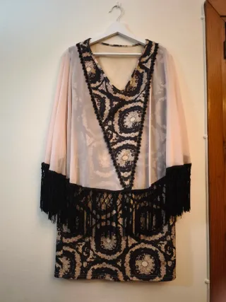 Vestido corto de fiesta con un diseño llamativo. - Mangas amplias y transparentes. - Adorno de flecos en el bajo. - Estampado circular en contraste. - Capa incorporada al traje.