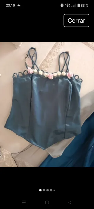 Elegante conjunto de dos piezas para ocasiones especiales. - Top con detalles brillantes y tirantes finos. - Falda larga de satén con corte sirena.
