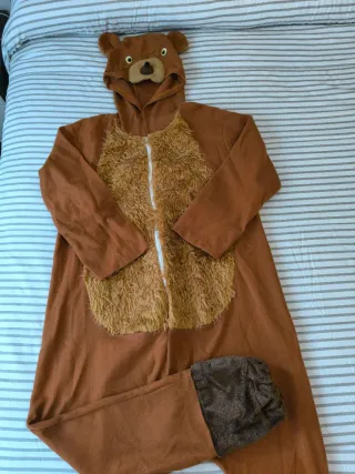 Disfraz de oso marrón con capucha. - Diseño con peluche en el pecho. - Cierre frontal con cremallera. - La etiqueta marca talla L, pero es muy grande. - Era muy corto de pierna y le añadí tela marrón. -Un solo uso