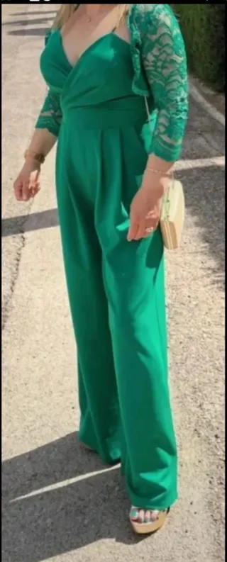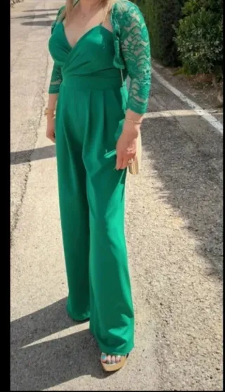 Elegante traje de fiesta. - Diseño de corte cruzado. - Pantalón ancho. - Incluye chaqueta corta de encaje.