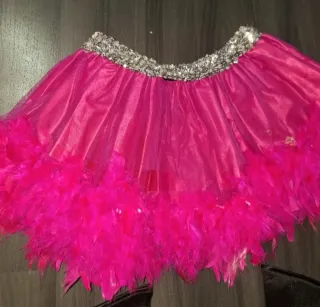 Conjunto de disfraz para carnaval o fiestas. - Falda corta rosa con detalles de plumas y borde plateado. - Botas altas negras con diseño de espiral en color rosa brillante.