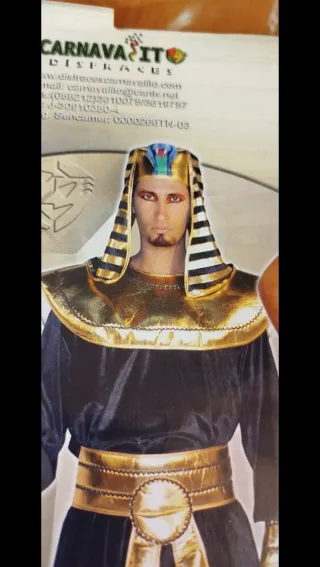 Disfraz de faraón para adulto, ideal para fiestas temáticas o carnaval. - Diseño inspirado en la vestimenta egipcia. - Incluye túnica corta, cinturón, cuello y gorro, negro con detalles dorados. - Talla única. - Utilizado una única vez.