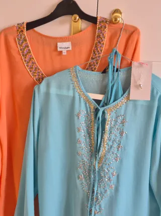 Conjunto de dos prendas de fiesta sin estrenar, ideal para ocasiones especiales. - Prenda superior en color naranja con detalles bordados en el cuello. - Prenda superior en color azul con bordados y lentejuelas. - Talla M / 38 / 10.
