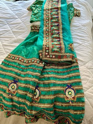 Conjunto de traje hindú con detalles bordados y lentejuelas. - Blusa con mangas cortas. - Falda con múltiples capas y bordes decorados. - Tejido ligero y vaporoso.