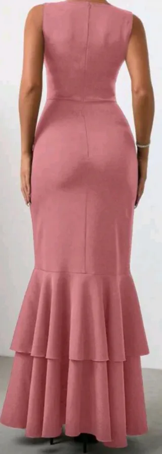 Elegante vestido largo de fiesta en color rosa, con un diseño inspirado en el traje de flamenca. Perfecto para eventos especiales. - Escote pronunciado en pico. - Corte sirena que se ensancha en la parte inferior. - Volantes escalonados en la falda.