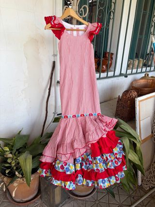 Traje de flamenca para niña, ideal para fiestas y eventos. - Diseño a rayas rojas y blancas. - Volantes en la falda con estampado de círculos. - Mangas cortas con volantes. Talla desde 10 años a una talla 36