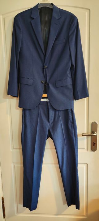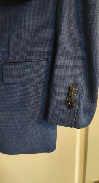 Traje de chaqueta para hombre color azul, juvenil, pequeños cuadros, ideal para eventos como orlas, bodas, fiestas... - Marca: Mango-The Suit Collection - Chaqueta de corte clásico - Pantalón a juego tipo slim - Botones en las mangas, posibilidad de modificarlos. - Amplio margen para modificar el alto de la manga de la chaqueta y el bajo del pantalón - Posibilidad de modificar la cintura en aproximadamente 2 cm.