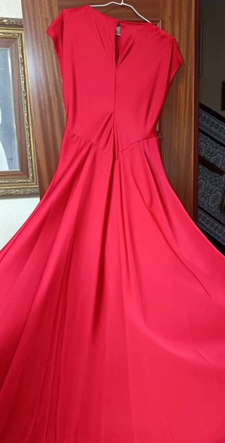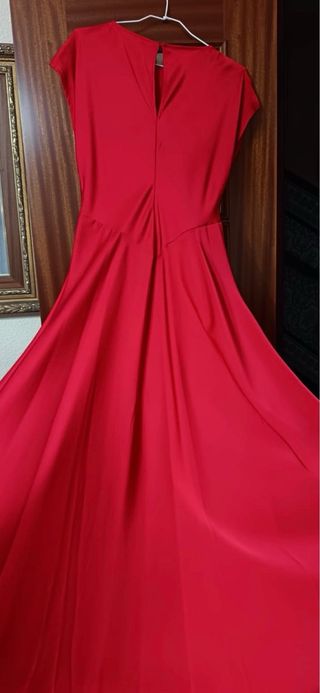 Elegante traje de fiesta en color rojo. - Diseño con escote en V. - Mangas cortas. - Falda larga y fluida.
