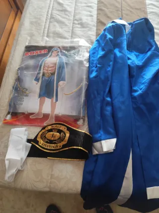 Disfraz de boxeo para hombre, ideal para fiestas temáticas o carnaval. Incluye varios accesorios para completar el look. - Bata de boxeo azul con detalles blancos. - Cinturón de campeón del mundo. - Vendas blancos. - Pantalón corto de boxeo.