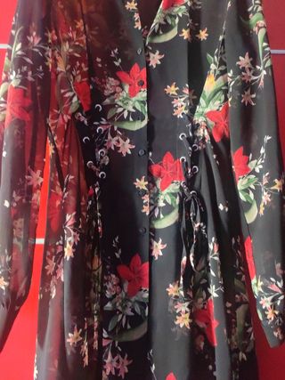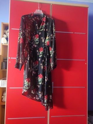 precioso bluson o captan para salir de fiesta o cena llega hasta la rodilla a mi que soy bajita con corte asimétrico de manga larga y transparente con unos lazo justo debajo del pecho para ajustar o soltar queda precioso. usado 2 veces talla S