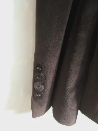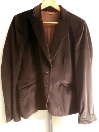 Pone alla 46 pero TALLA PEQUEÑO como 44/42.MEDIDAS EN ULTIMA FOTO .Elegante blazer de terciopelo para mujer en un sofisticado tono marrón chocolate. Una prenda versátil que aporta un toque de distinción..fiesta, fin de año informal vaqueros Medidas última foto - Material: Terciopelo suave al tacto. - Diseño: Corte clásico de blazer,acabado de bajos redondeado - Cierre: Dos botones frontales. - Bolsillos: Dos bolsillos de solapa en la parte delantera ,opción de llevar por fuera o por dentro - Puños: Detalle de botones en los puños. # cortefiel # americana