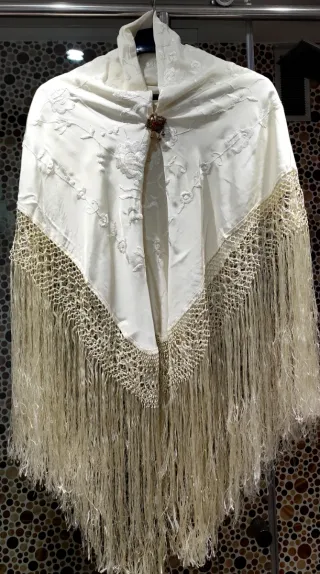 Traje tradicional de Baturra, ideal para fiestas y celebraciones. - Tejido principal en color blanco con bordados florales. - Adornado con un delicado encaje en los bordados. - Incluye un broche decorativo con pedrería. - Amplia caída con flecos largos y finos.