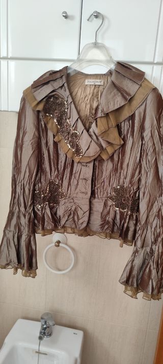 Dos piezas fiesta de color rosa palo y dorada la chaqueta. Los dos son de la talla 46. De la marca María Coca. El cuerpo es de manga corta con unas aberturas por detrás. La chaqueta es de manga larga.