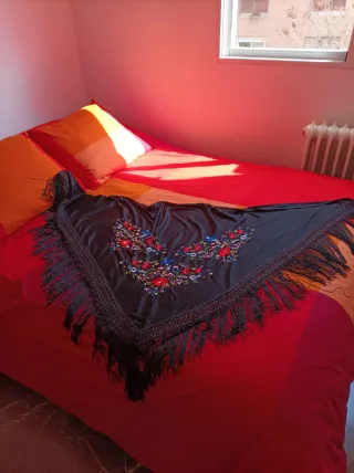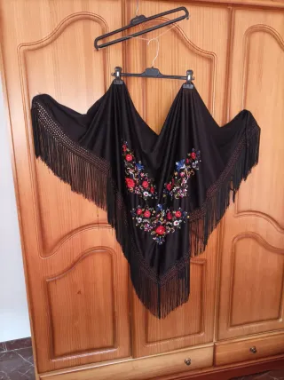 Manton de fiesta con un bonito diseño bordado. - Diseño de flores en varios colores. - Flecos largos en todo el borde.