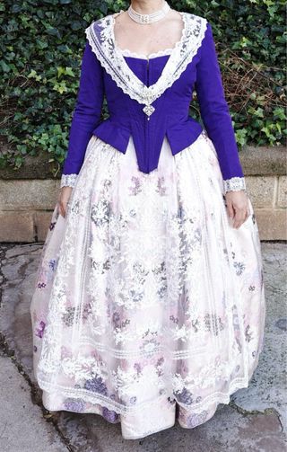 Traje de fallera compuesto por corpiño y falda, listo para lucir. Incluye manteletas. - Talla 38-40. - Diseño con detalles en encaje blanco. - Corpiño de color morado intenso. - Falda con estampado floral en tonos morados y rosas. - Manteletas en perfecto estado incluidas.