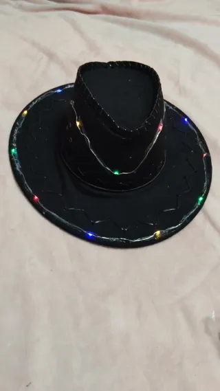 Este sombrero vaquero negro es un accesorio divertido y llamativo, perfecto para fiestas o disfraces. - Adornado con luces LED de colores. - Diseño de estilo vaquero clásico.