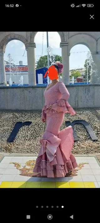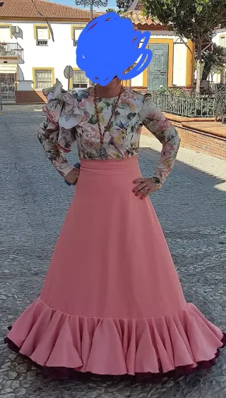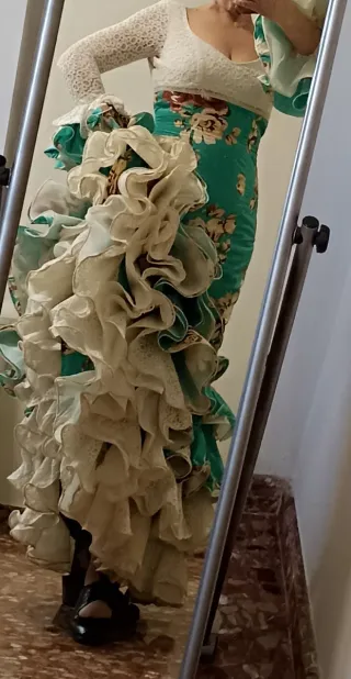 Traje de flamenca de la marca Aires de Feria, talla 38. Un diseño elegante con un estampado floral vibrante. Cuerpo blanco roto de encaje con escote en pico y mangas largas. Falda larga con volantes y estampado floral sobre fondo verde. Muy cómodo ya que no pesa nada. Medidas aproximadas; Pecho 90 Cintura 75 Cadera 90 Largo 1,40 cm. Tiene para sacar tanto de largo como de ancho ( hay foto)