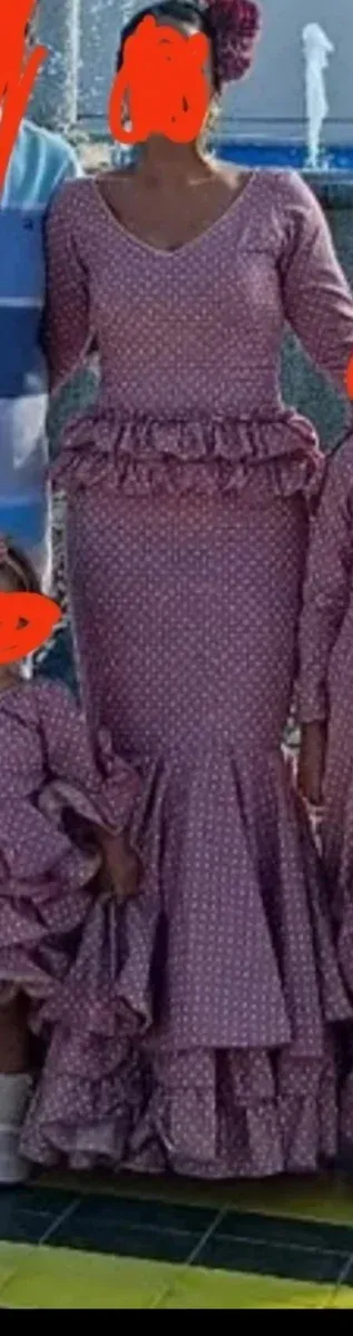 Traje de flamenca con un diseño vibrante y elegante. - Cuerpo con estampado floral. - Falda larga con volantes. - Detalle de volantes en el hombro.