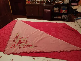 Conjunto de delantal y manteleta de niña para traje regional. Pieza delicada con un diseño intrincado. Medidas: 0,40 de ancho × 0,90 de largo y 3,60 de lazo - Adornos de encaje y lentejuelas. - Cintas para atar.